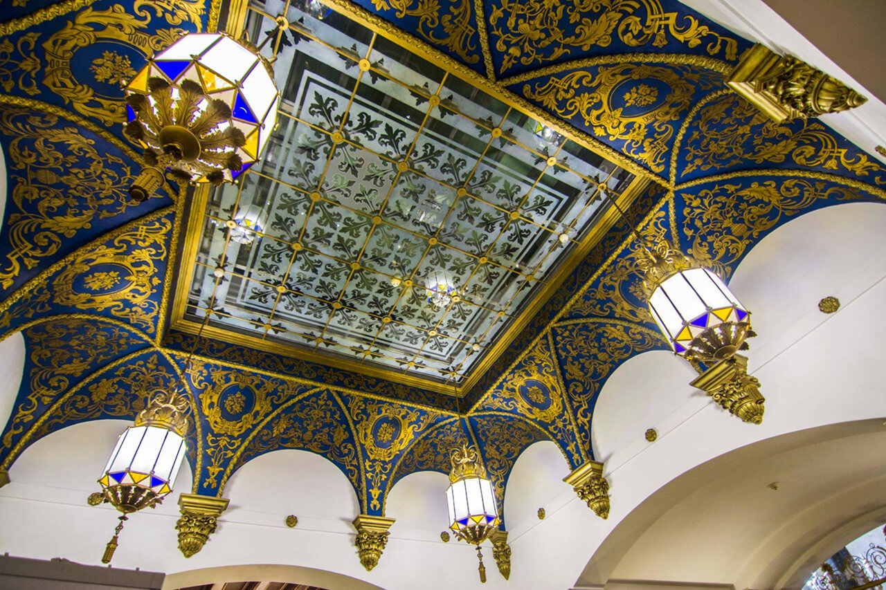 Дизайн входной зоны вызывает ассоциации то ли с царскими покоями, то ли с храмом, то ли с кремлевскими палатами: декоративная резьба по дереву, золотое покрытие, разрисованные плафоны, диковинные молдинги и осветительные приборы. Пространство перед лифтами стилизовано под алтарную апсиду, а подвесные светильники на лестничных площадках напоминают церковные хоросы.